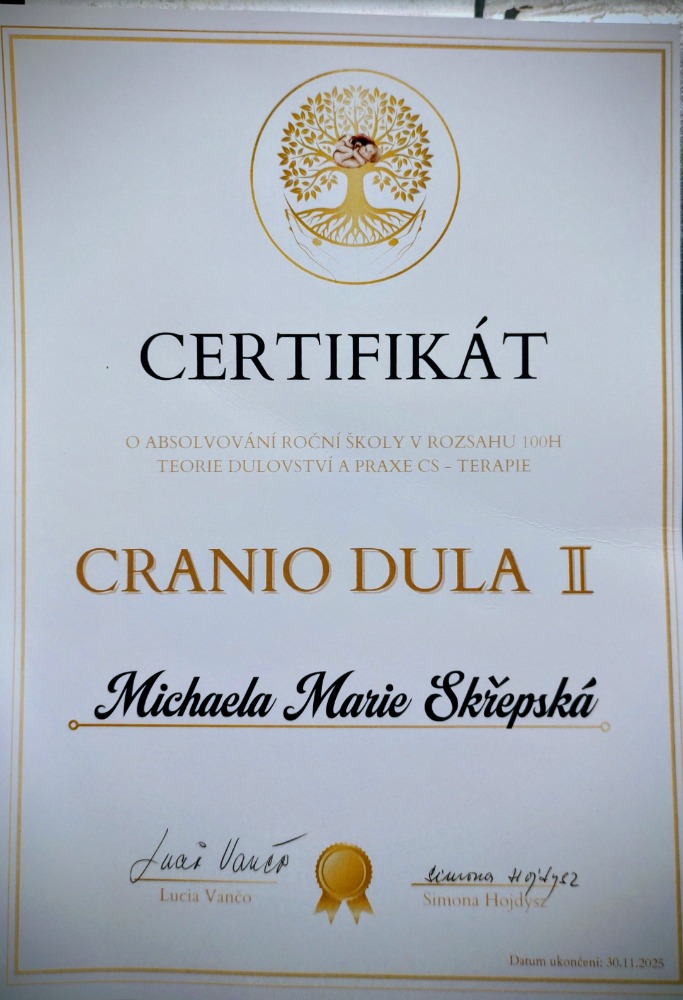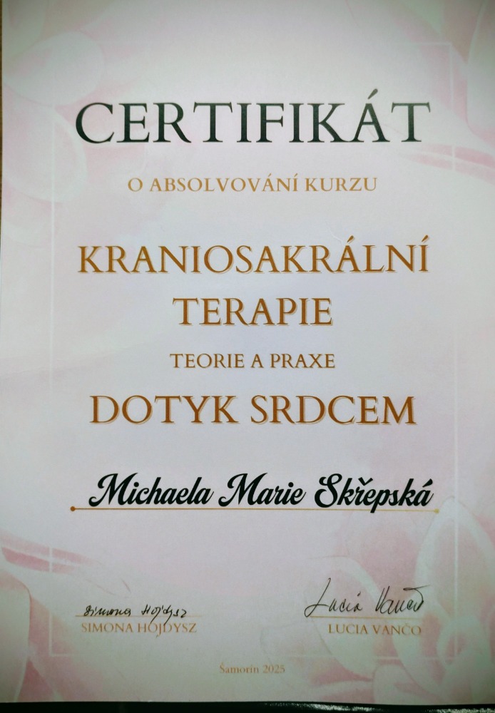 Nabízím ošetření pomocí plnospektrální kraniosakrální terapie s prvky biodynamiky. Tato metoda zahrnuje přístup, který se zaměřuje na zdraví jako přirozený a plnohodnotný stav lidské bytosti. Pracujeme v prostoru „bez mysli“, kde se dějí veškeré ozdravné a potřebné procesy. Vycházím z přístupu Etienna Peirsmana a zahrnuji reflexní terapii a prvky z tradiční čínské medicíny.