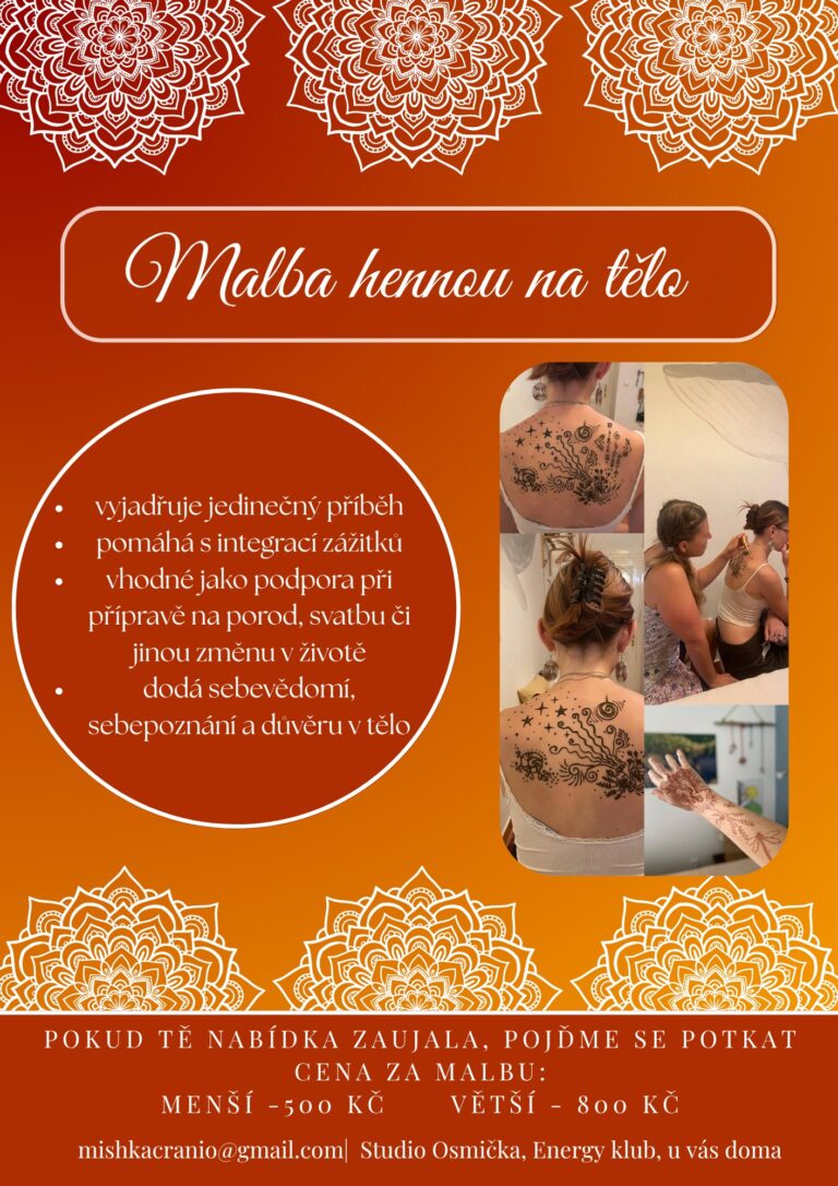 Naše kolegyně Michaela Marie Skřepská , která se ve studiu Osmička věnuje kraniosakrální terapii, rozšiřuje svou nabídku – nově se k ní můžete objednat i na malování henou!